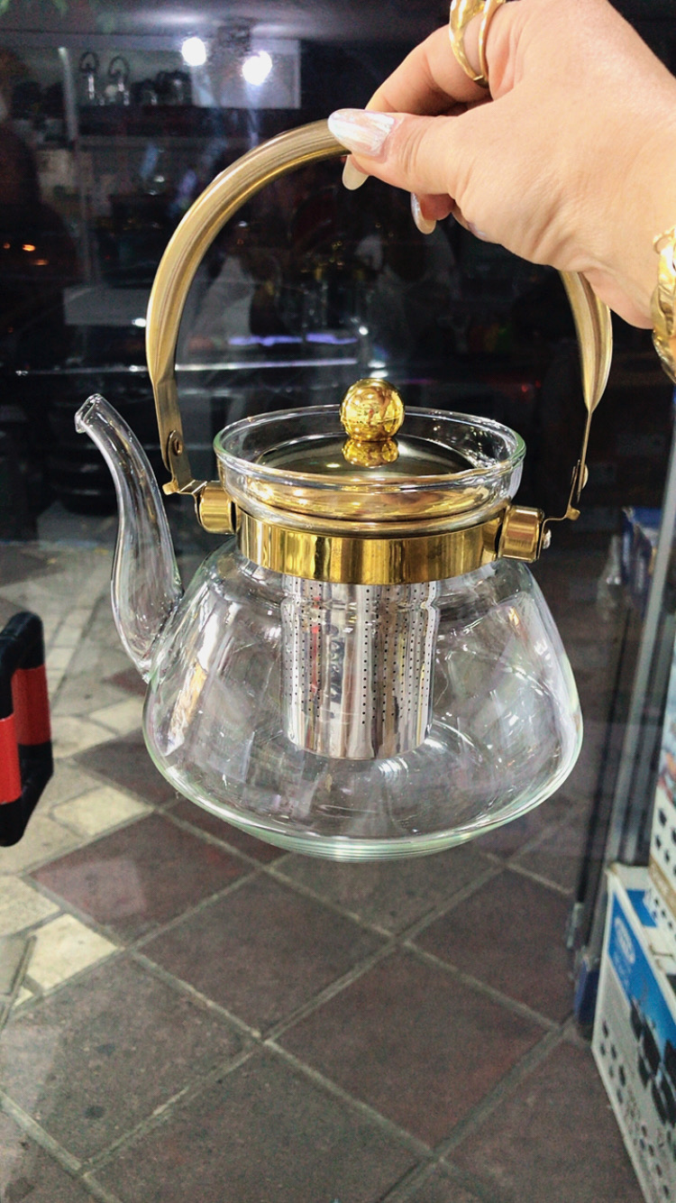 سه تیکه شامل بدنه شفاف با دسته فلز طلایی ، درب و دستگیره فلزی طلایی و صافی استیل